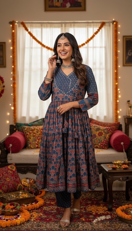 Celebrate the legacy of handcrafted prints with our Ajrak Charm 3-Piece Suit Set. Featuring intricate block prints in deep indigo, maroon, and subtle beige, this set reflects traditional beauty with a modern silhouette. The kurta’s gathered flare adds grace, while the full sleeves and printed pants bring complete sophistication.