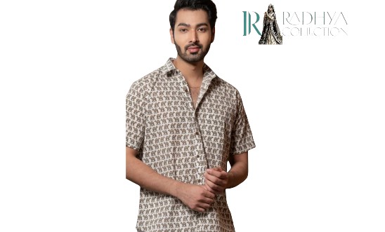 Elevate your casual wardrobe with this handblock printed men’s shirt from Radhya Collection. Made with premium cotton, the shirt features traditional elephant motifs on a beige base, giving it a blend of ethnic charm and modern style. Perfect for casual outings, festive events, or holiday wear.