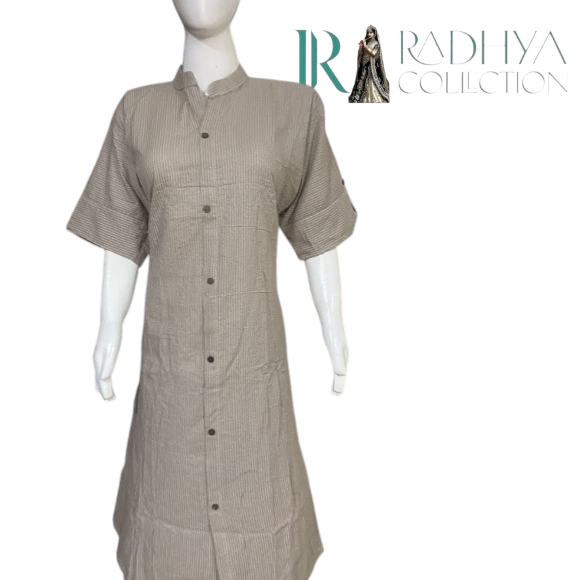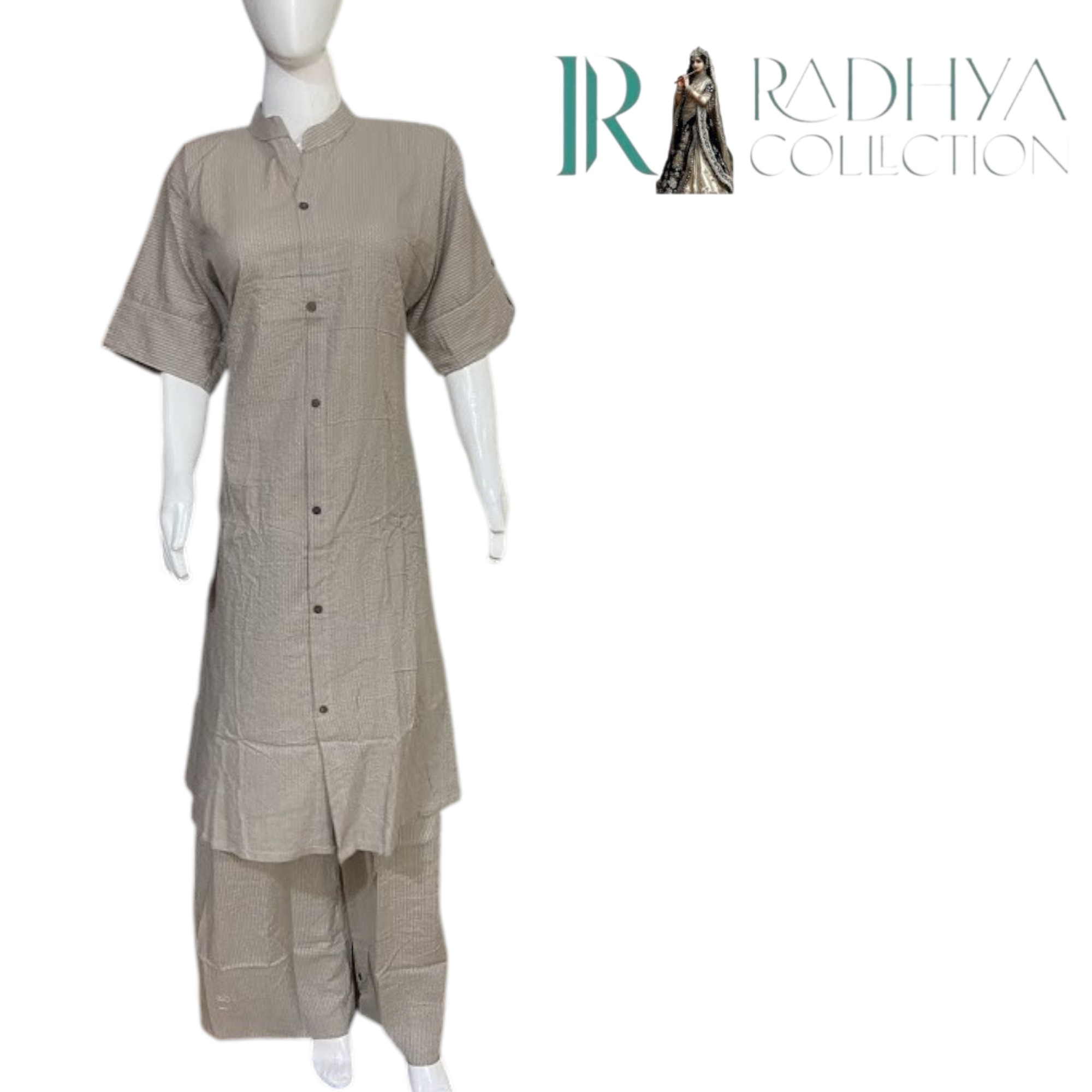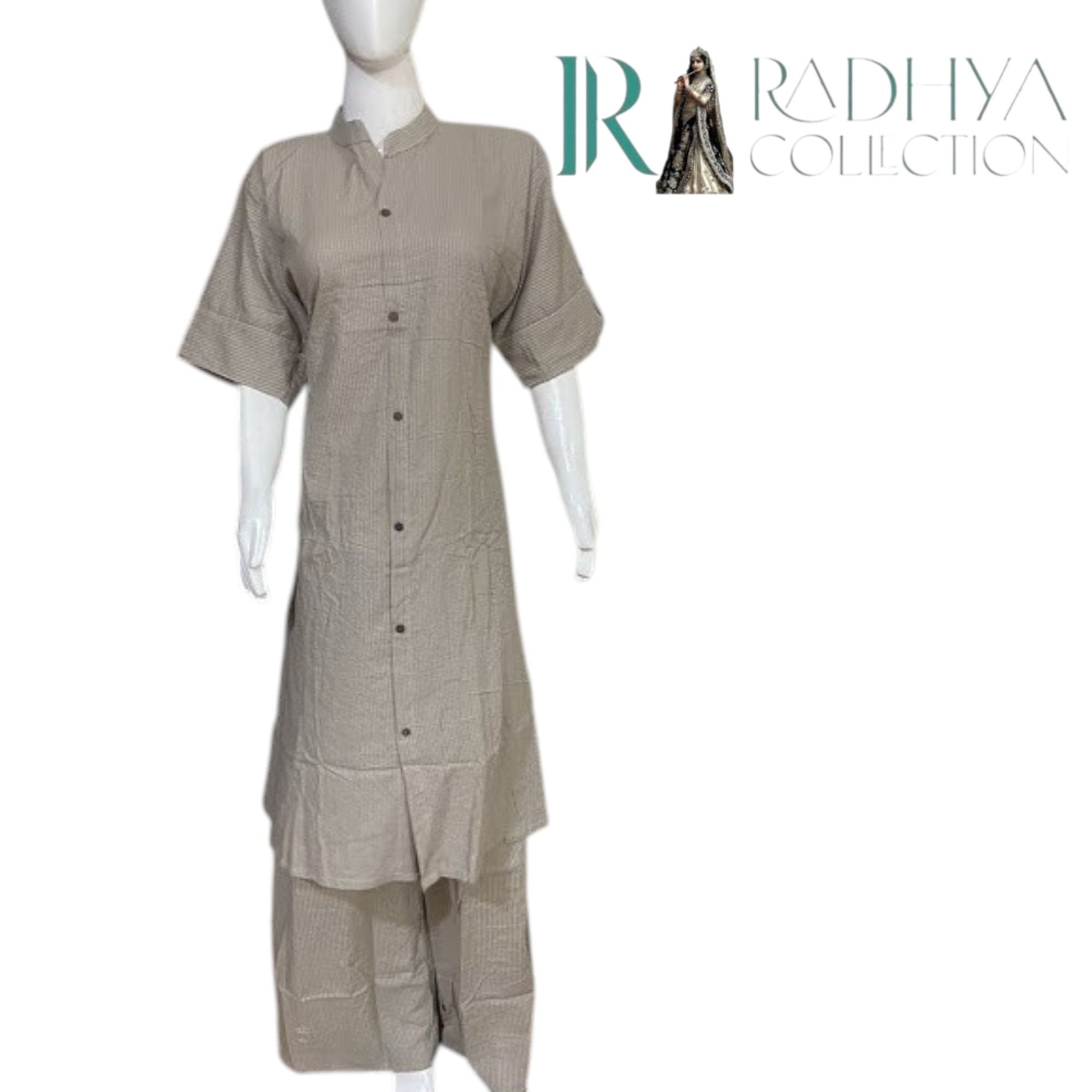 Elegant and artisanal, this beige katha kurti set features intricate multicolour hand-stitched patchwork, giving each piece a unique, handcrafted charm. The straight-cut kurti is highlighted with delicate katha embroidery along the neckline and hem, paired with comfortable matching pants that showcase subtle woven motifs. Made from breathable cotton, it blends tradition with everyday comfort, making it an ideal choice for casual outings, festive gatherings, or workwear with a touch of artistry.