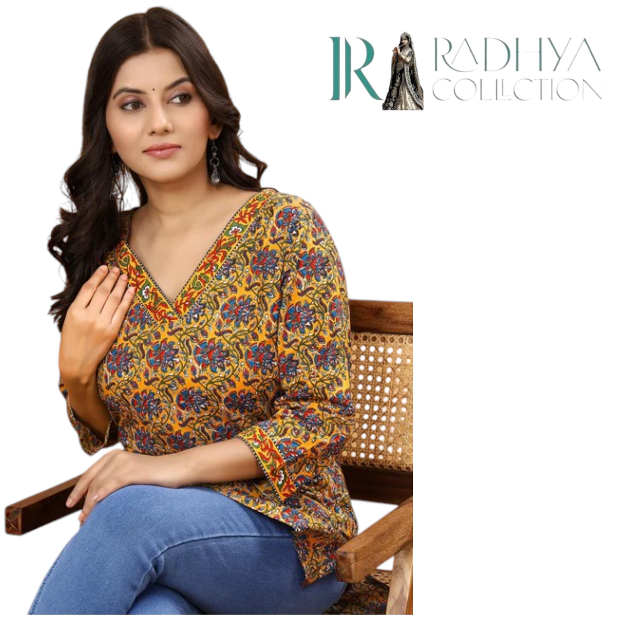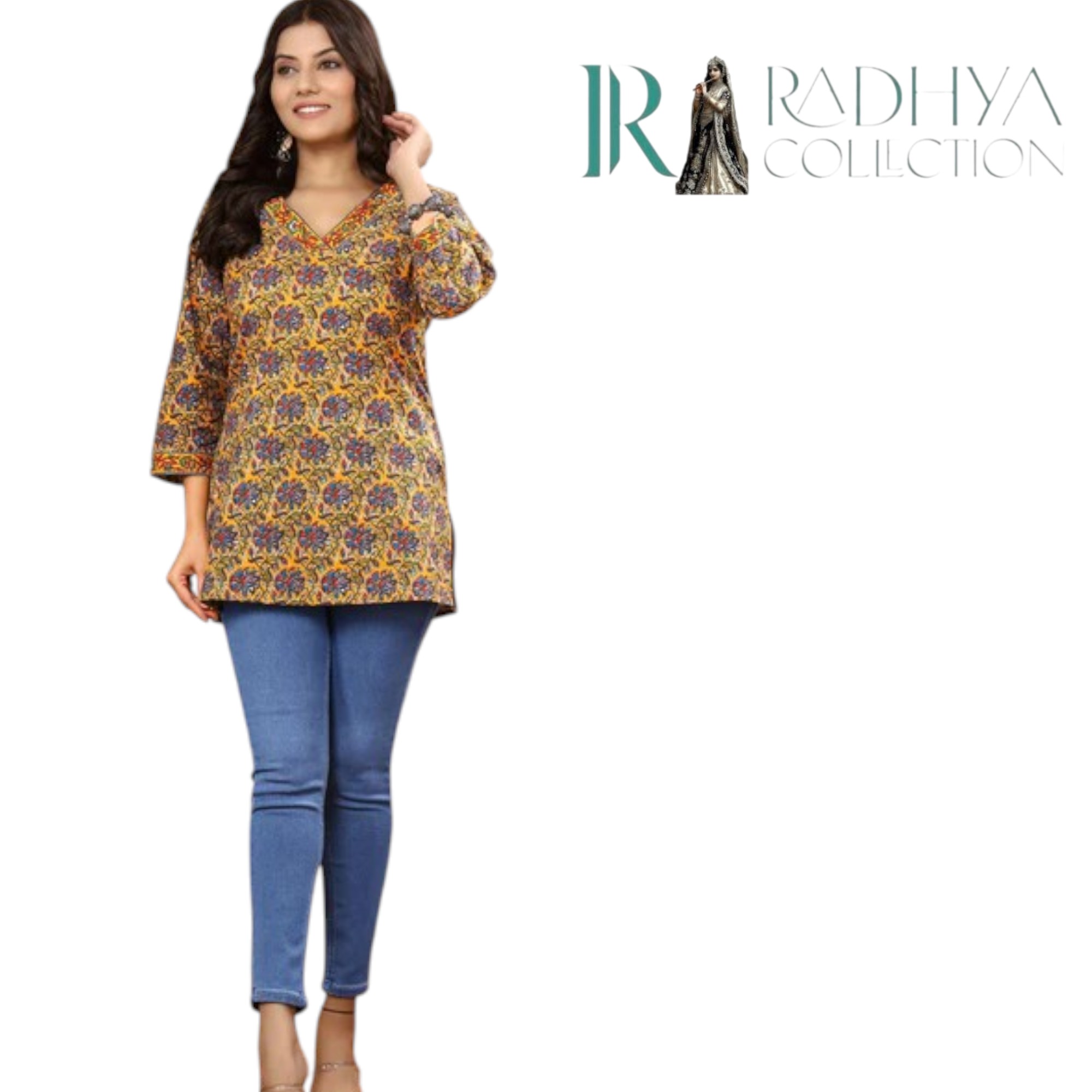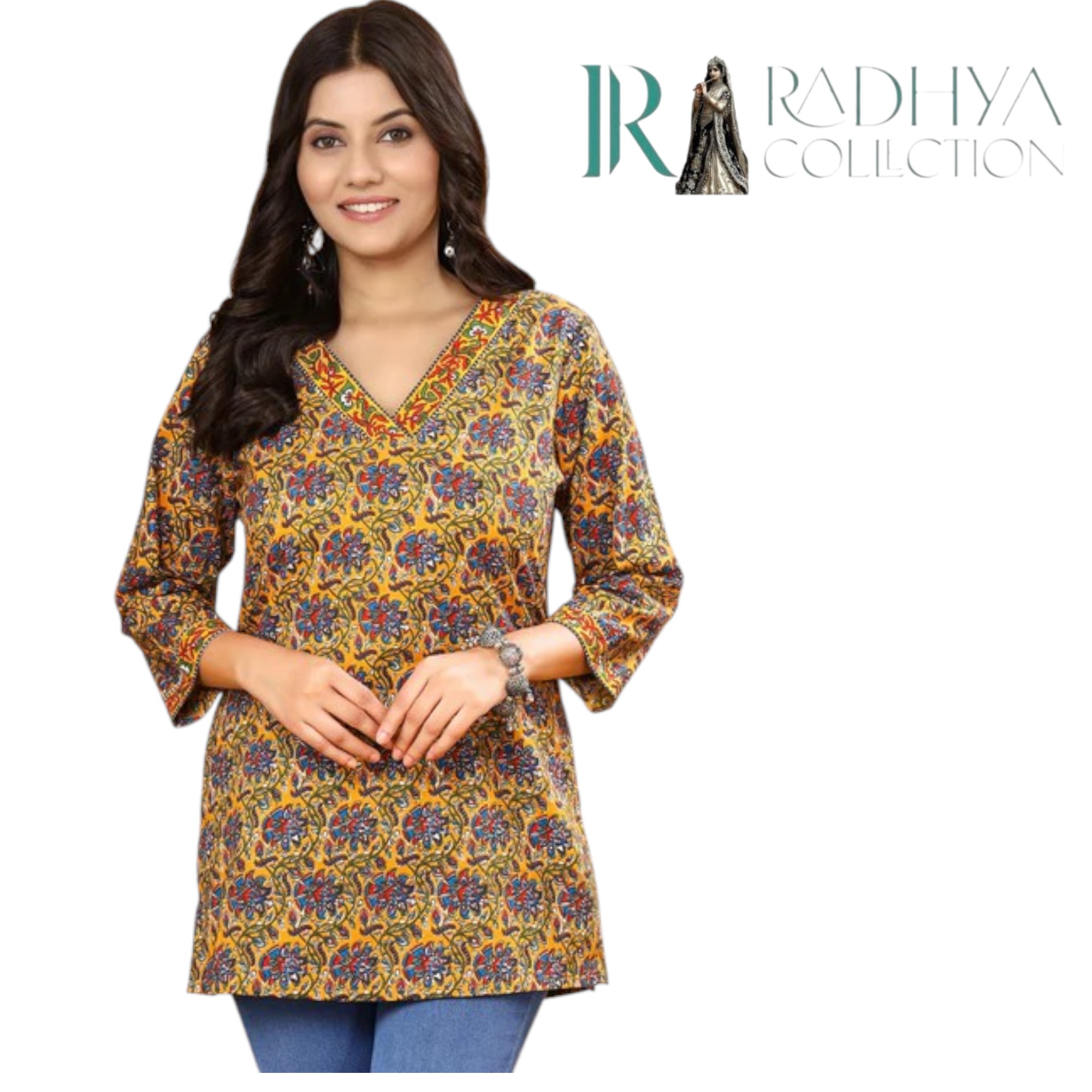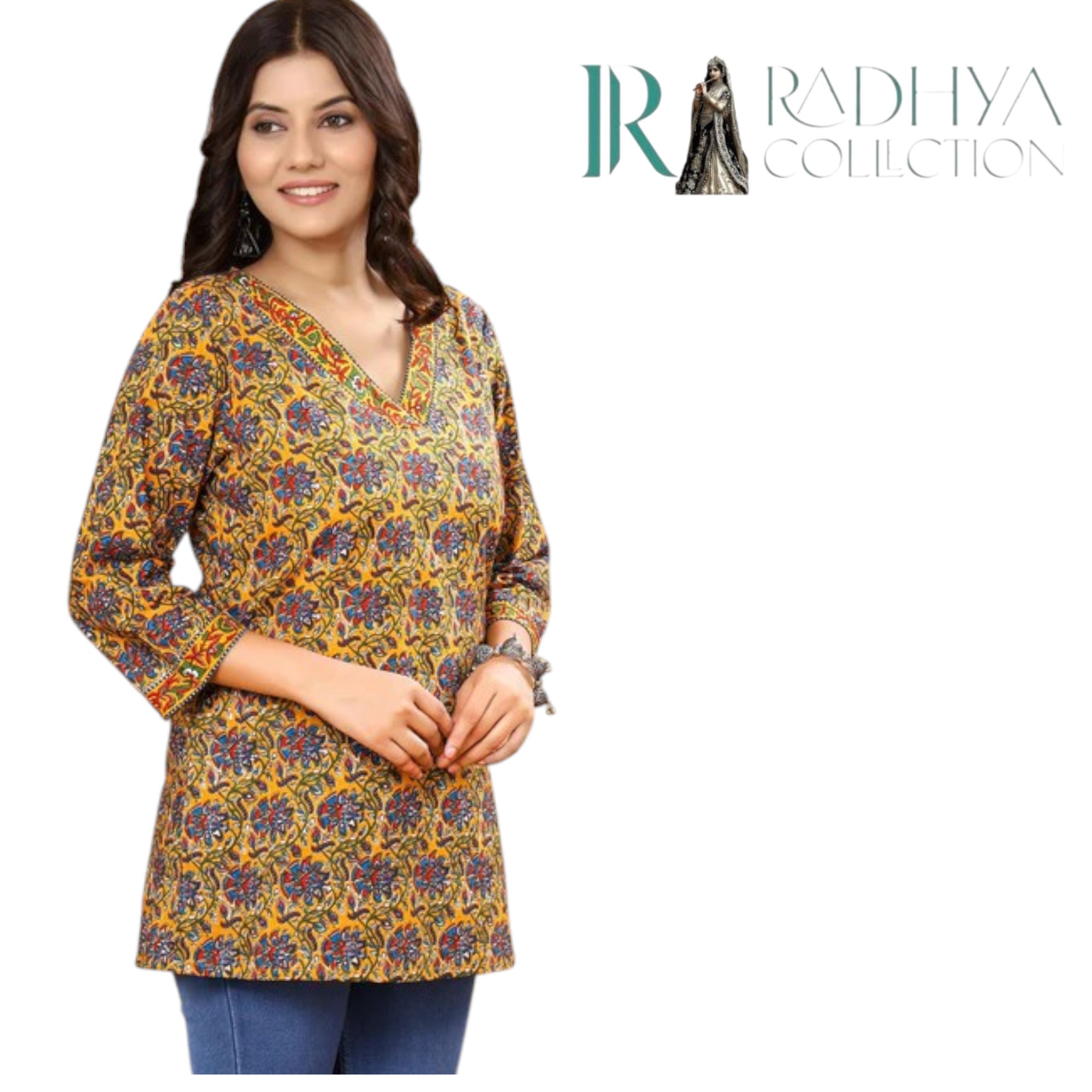 Infuse your style with traditional artistry through this mustard Kalamkari print cotton top from Radhya Collection. Designed with intricate floral motifs in deep red and blue, this piece celebrates Indian heritage while offering modern-day comfort. The V-neckline and three-quarter sleeves are highlighted with a delicate printed border, enhancing its ethnic charm. Made from soft, breathable cotton, it’s perfect for all-day wear — whether you’re heading to work, a casual meet-up, or a festive gathering.