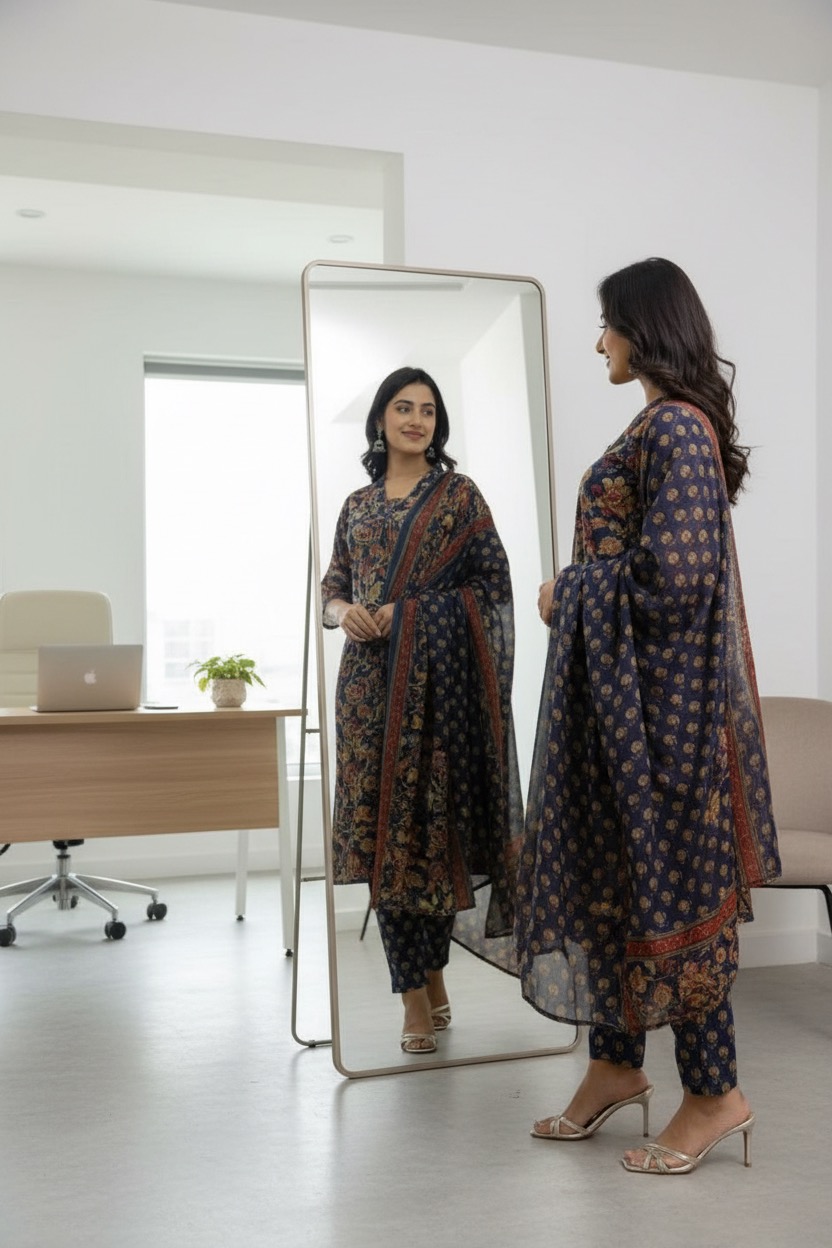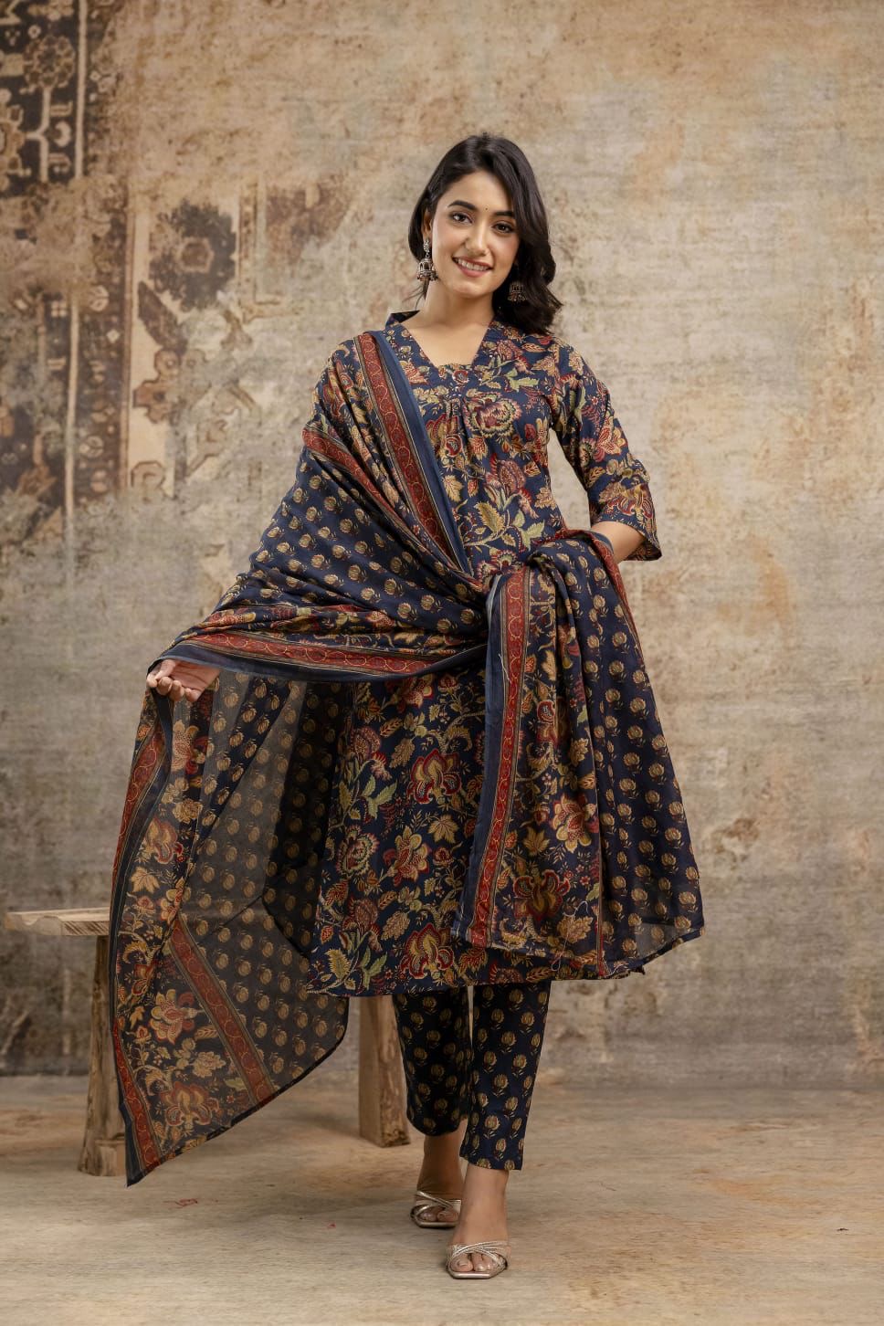 This navy blue handblock-printed three-piece kurta set is crafted in breathable cotton, designed for all-day comfort without compromising on style. The straight-cut kurta showcases intricate multicolour floral and paisley motifs inspired by traditional Ajrakh-style block printing, paired with tapered printed pants for a streamlined silhouette. A lightweight, flowy dupatta with a coordinated border and buti pattern completes the look, making it perfect for office wear, festive gatherings, and casual outings when styled with statement silver jewellery and comfortable flats.