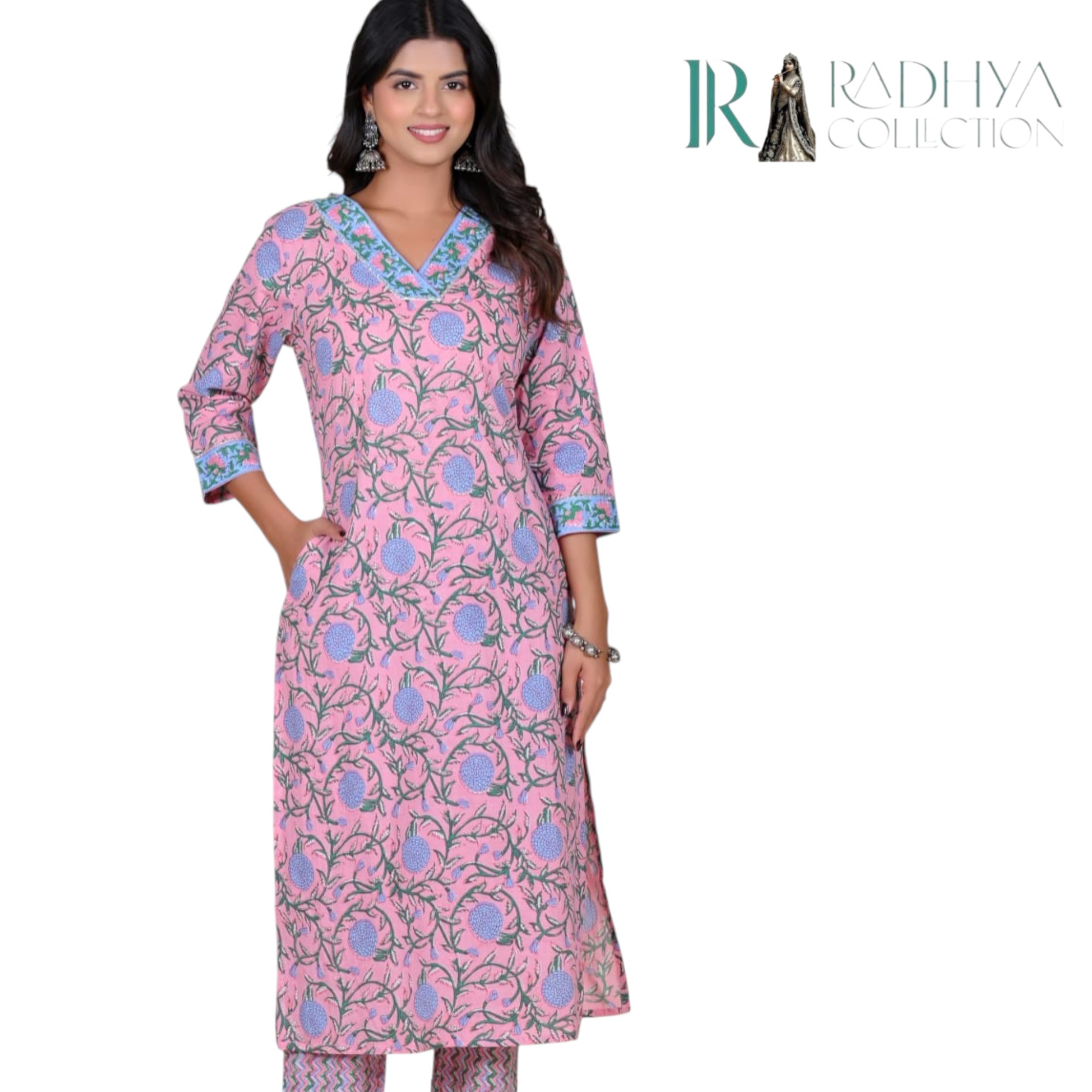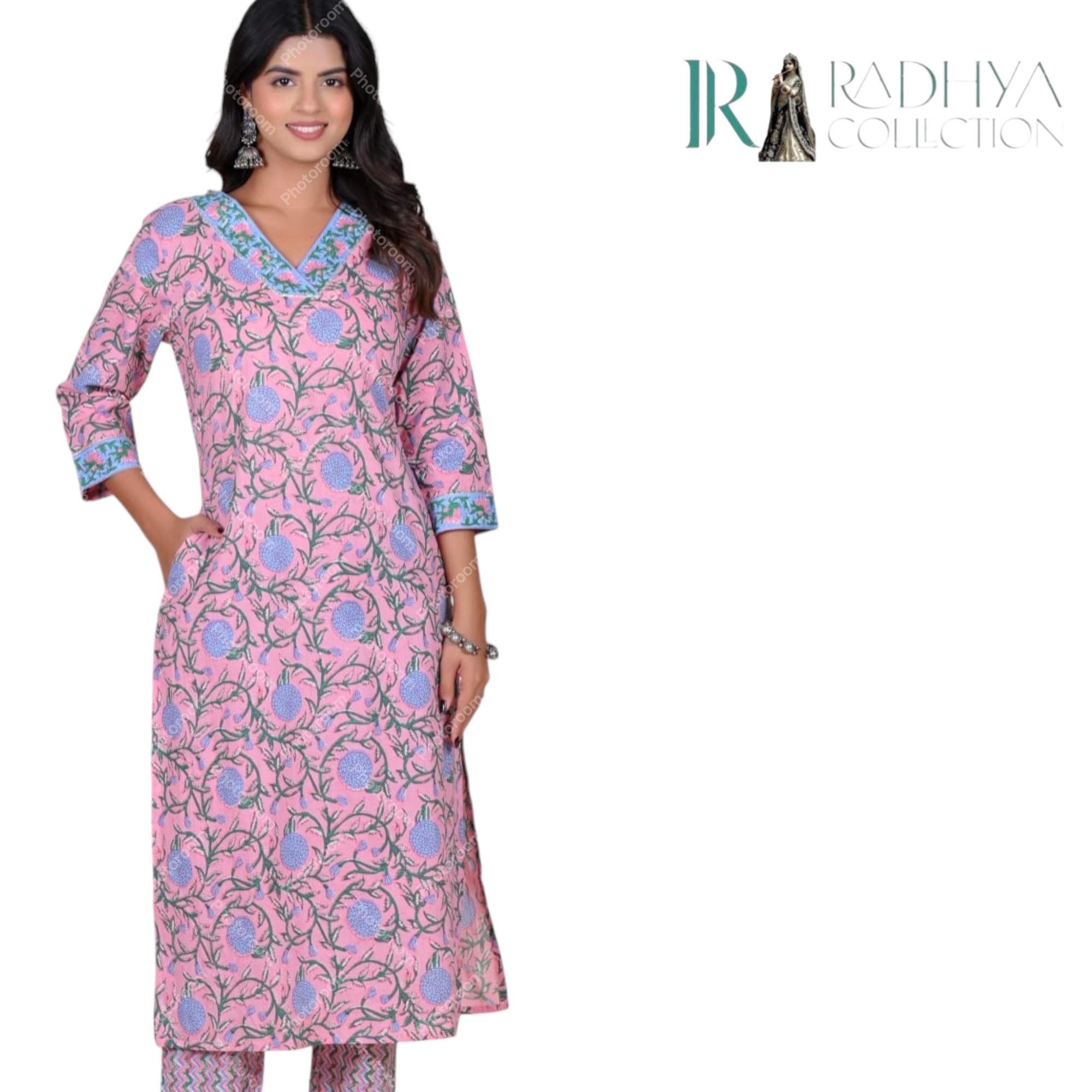 Add a burst of freshness to your ethnic wardrobe with this charming pink cotton kurti set. Featuring bold blue floral block prints with intricate green vines, the kurti is enhanced by a stylish double-layered V-neckline and detailed sleeve cuffs in a contrasting blue border. It is perfect balance between tradition and trend. Ideal for everyday comfort with a touch of elegance.