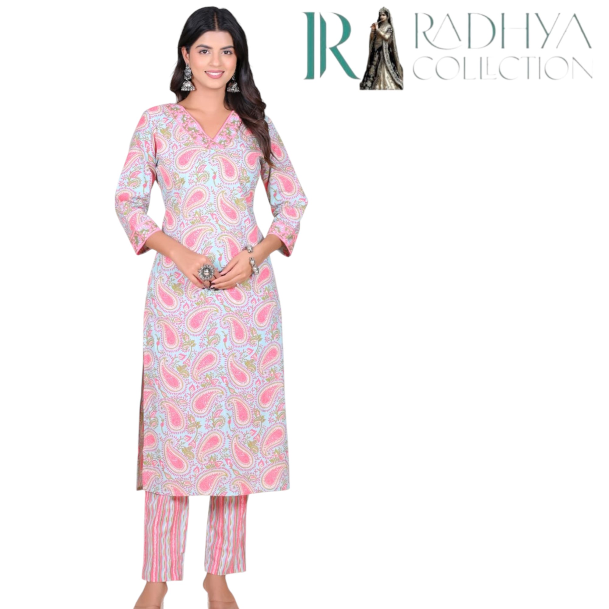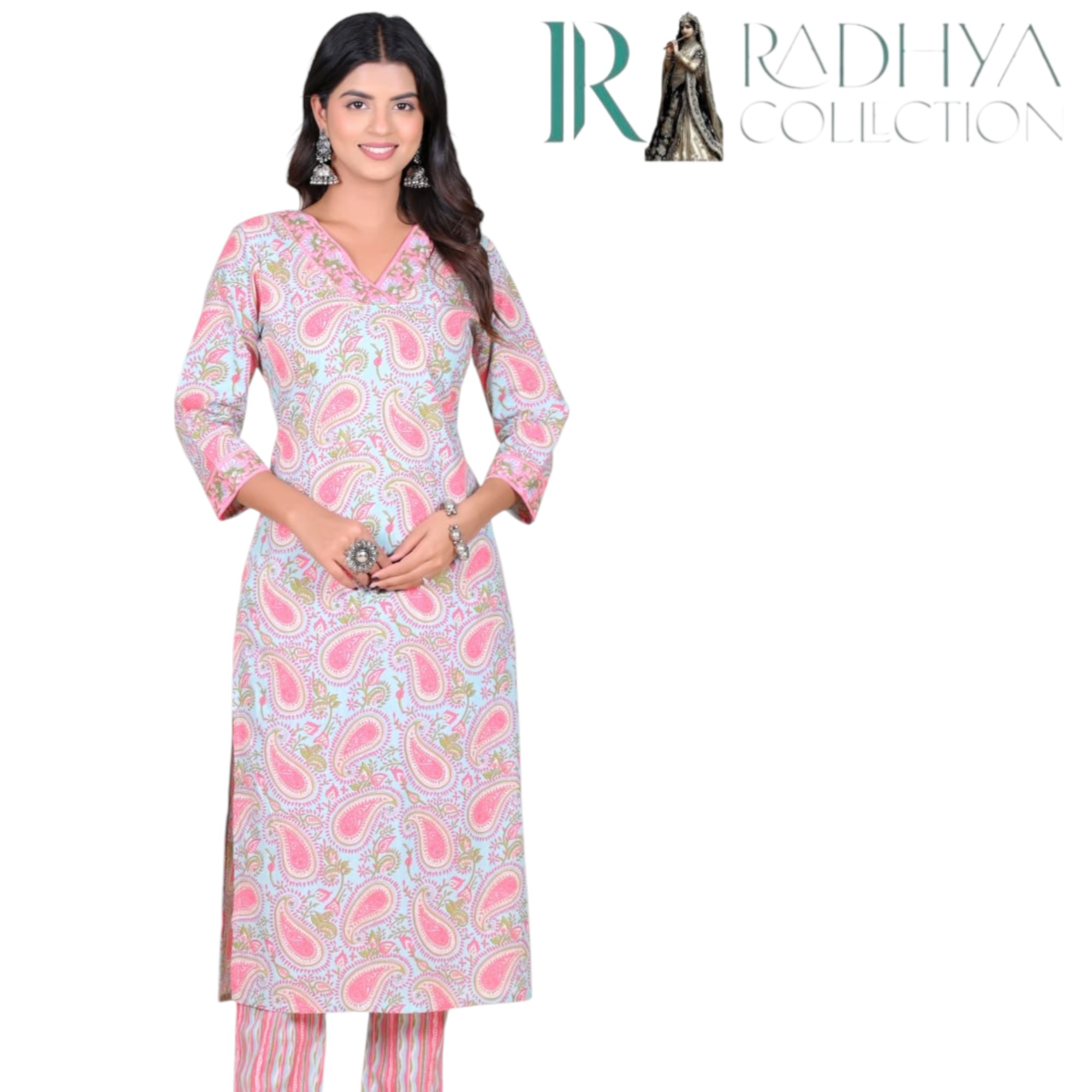 Brighten your day with this cheerful and stylish 2-piece Kurti Set in soft cotton fabric. Adorned with an all-over pink paisley print, this kurti exudes charm with its tailored V-neckline, 3/4th sleeves, and straight silhouette. Light, breathable, and easy to wear—this is a go-to choice for everyday wear with a stylish edge.