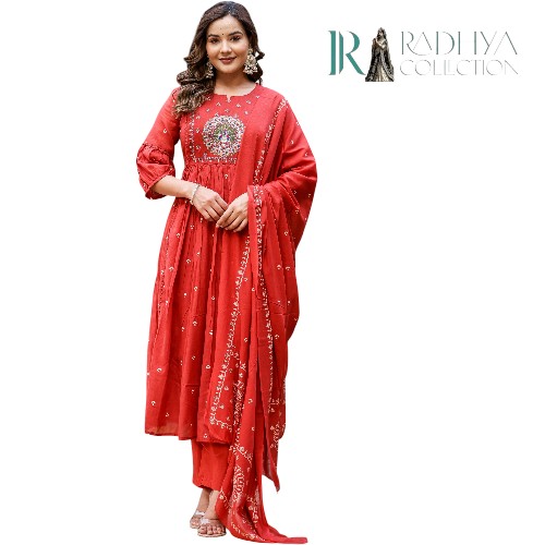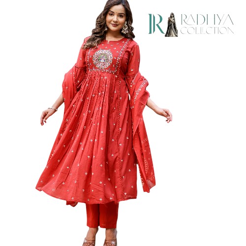 Turn heads this season with this stunning red festive embroidered Anarkali set from Radhya Collection. Designed with intricate embroidery on the yoke and delicate mirror work, this ensemble exudes elegance and charm. The flared silhouette adds a graceful flow, while the matching bottoms and dupatta complete the festive-ready look.