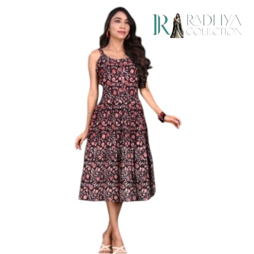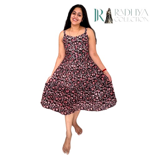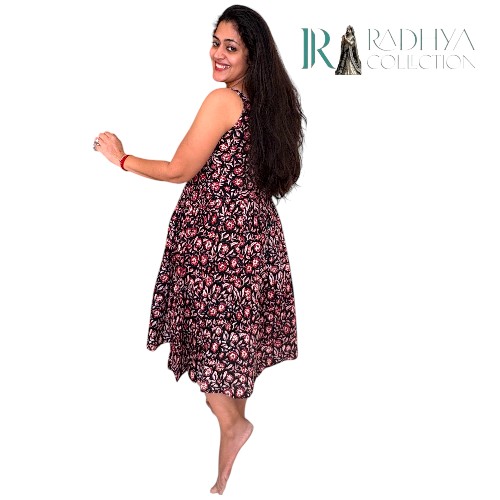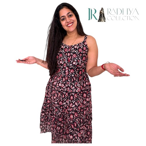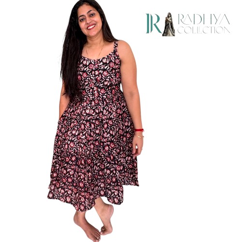 Add a touch of elegance to your wardrobe with this sleeveless floral cotton midi dress from Radhya Collection. Crafted in soft breathable cotton, the dress features a chic black base with vibrant red & pink floral prints, perfect for both casual outings and relaxed evenings. The A-line flowy silhouette and mid-length design ensure comfort with style.