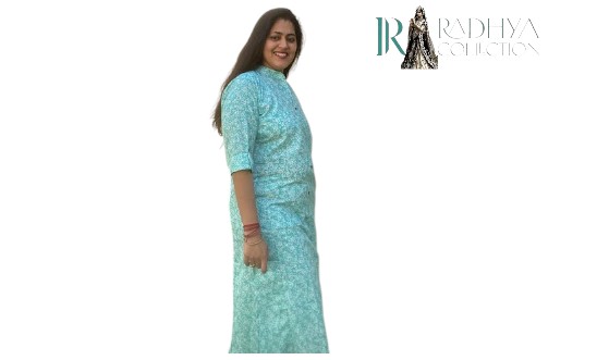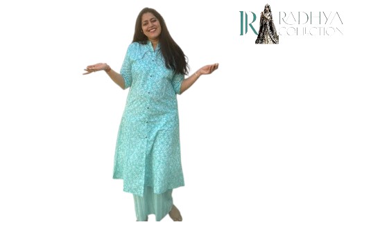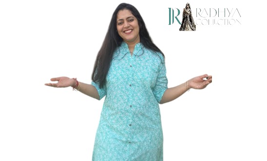 Stay stylish yet comfortable in this turquoise floral printed kurta set from Radhya Collection. Made with lightweight, breathable cotton, the kurta features a smart shirt-style collar and front buttons, giving it a contemporary twist on ethnic wear. Paired with matching bottoms, this 2-piece set is perfect for casual outings, office wear, or relaxed festive gatherings.