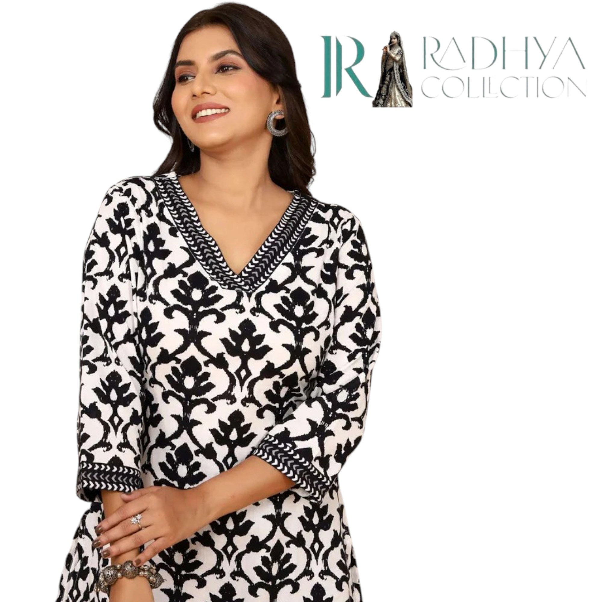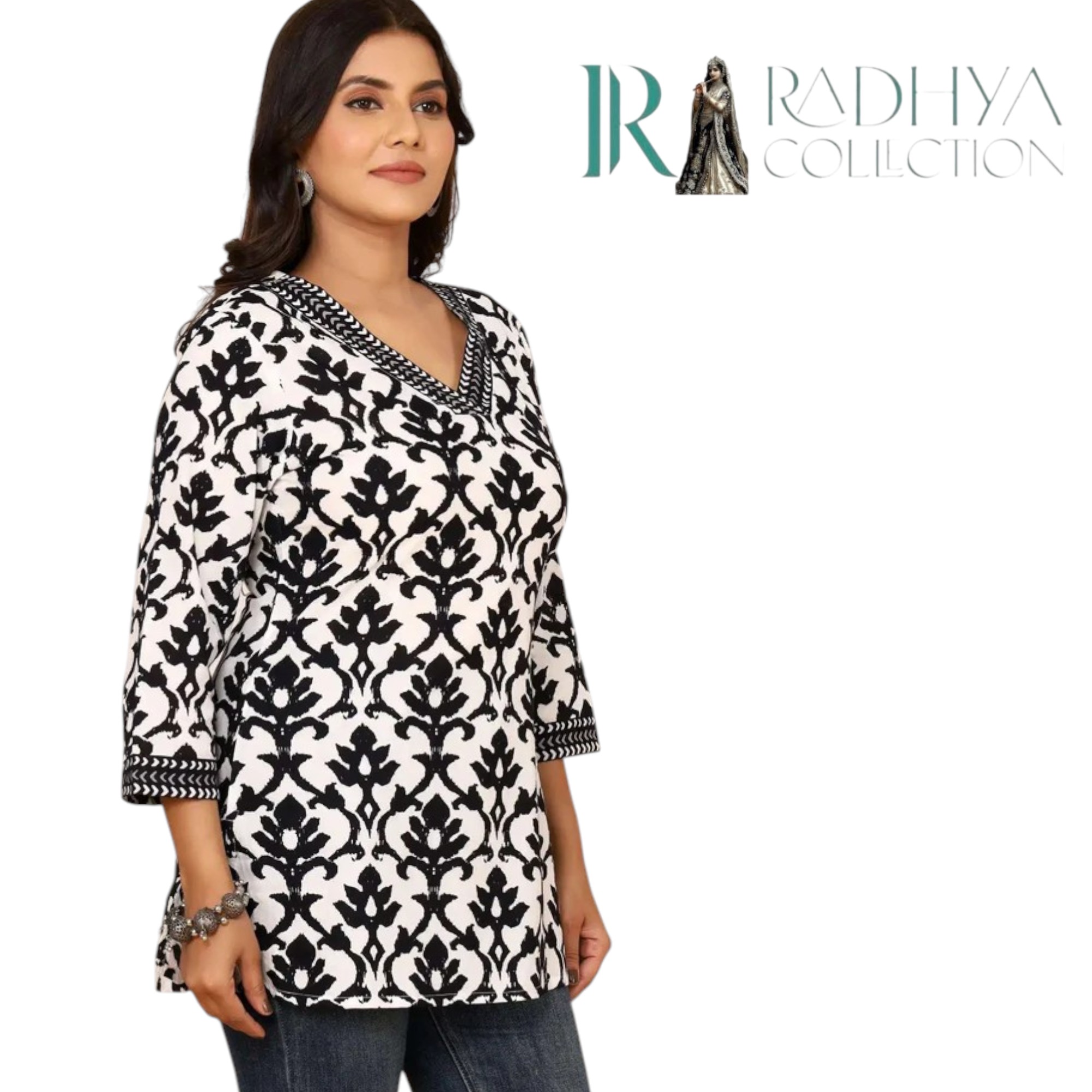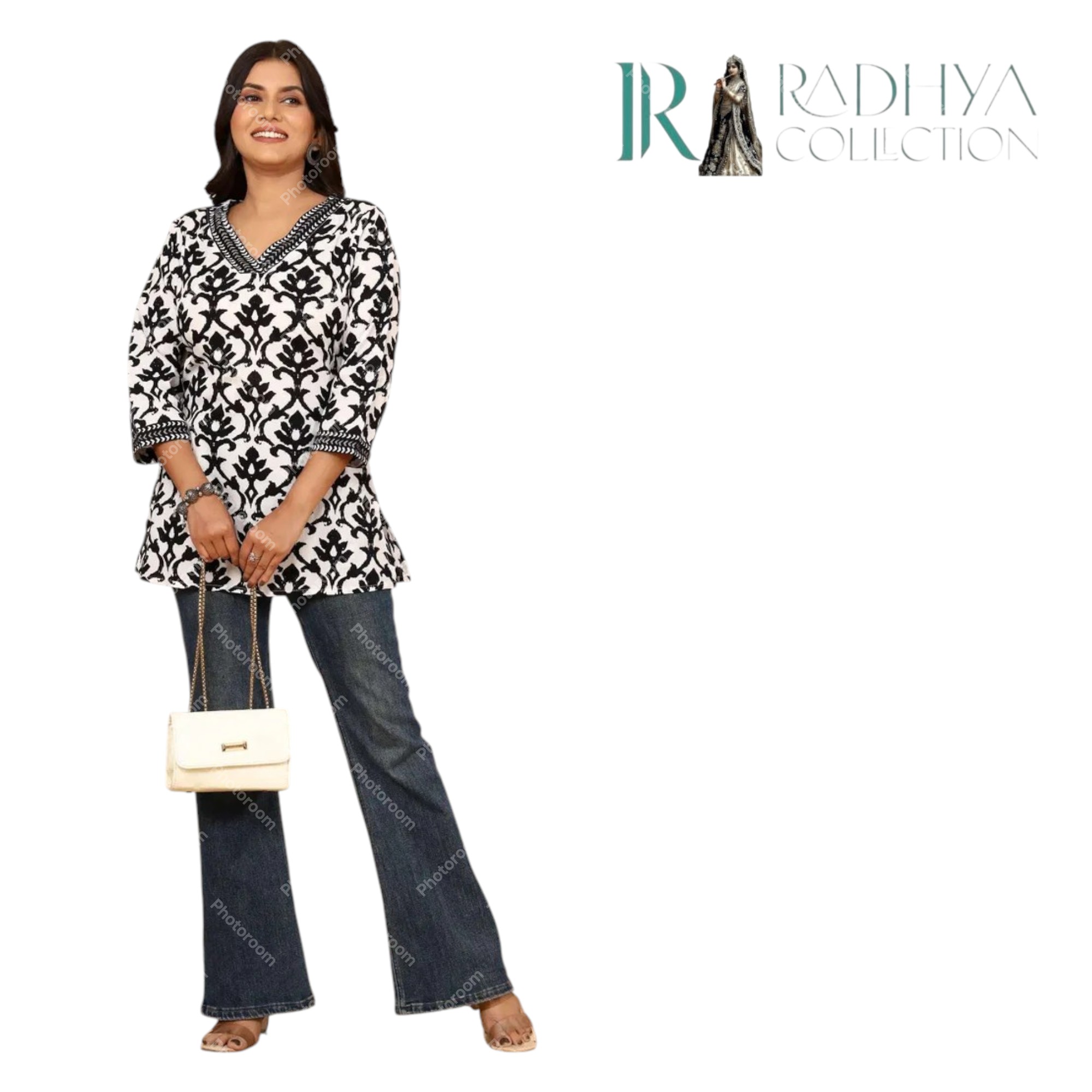 Add a touch of elegance to your casual wardrobe with this black and white printed cotton top from Radhya Collection. Featuring a bold floral damask-inspired print, this top is crafted from soft, breathable cotton for all-day comfort. The V-neckline and three-quarter sleeves are adorned with a contrasting chevron border, giving it a stylish, handcrafted appeal. Perfect for pairing with jeans, trousers, or skirts, it’s a versatile choice for both work and casual outings.