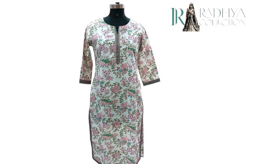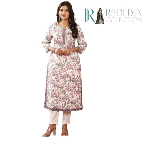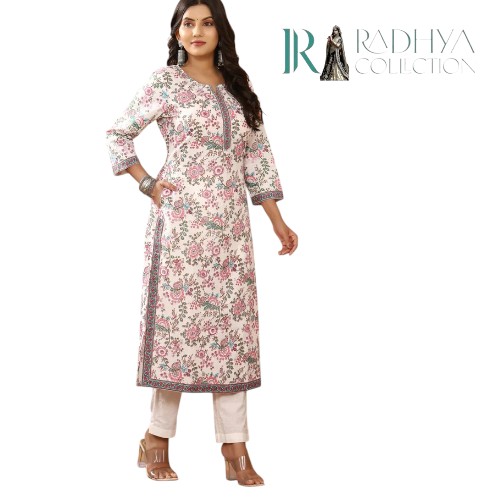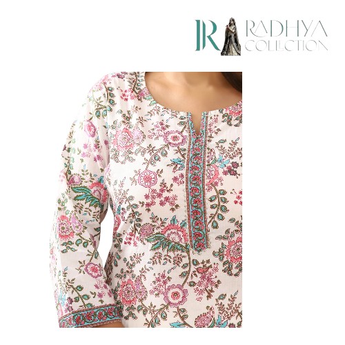 Add a touch of elegance to your everyday look with this white floral cotton kurti from Radhya Collection. Featuring a straight fit with side slits, 3/4th sleeves, and a button-down neckline, this kurti is designed for all-day comfort while keeping you stylish. The pastel floral print makes it perfect for casual outings, office wear, or relaxed festive gatherings.