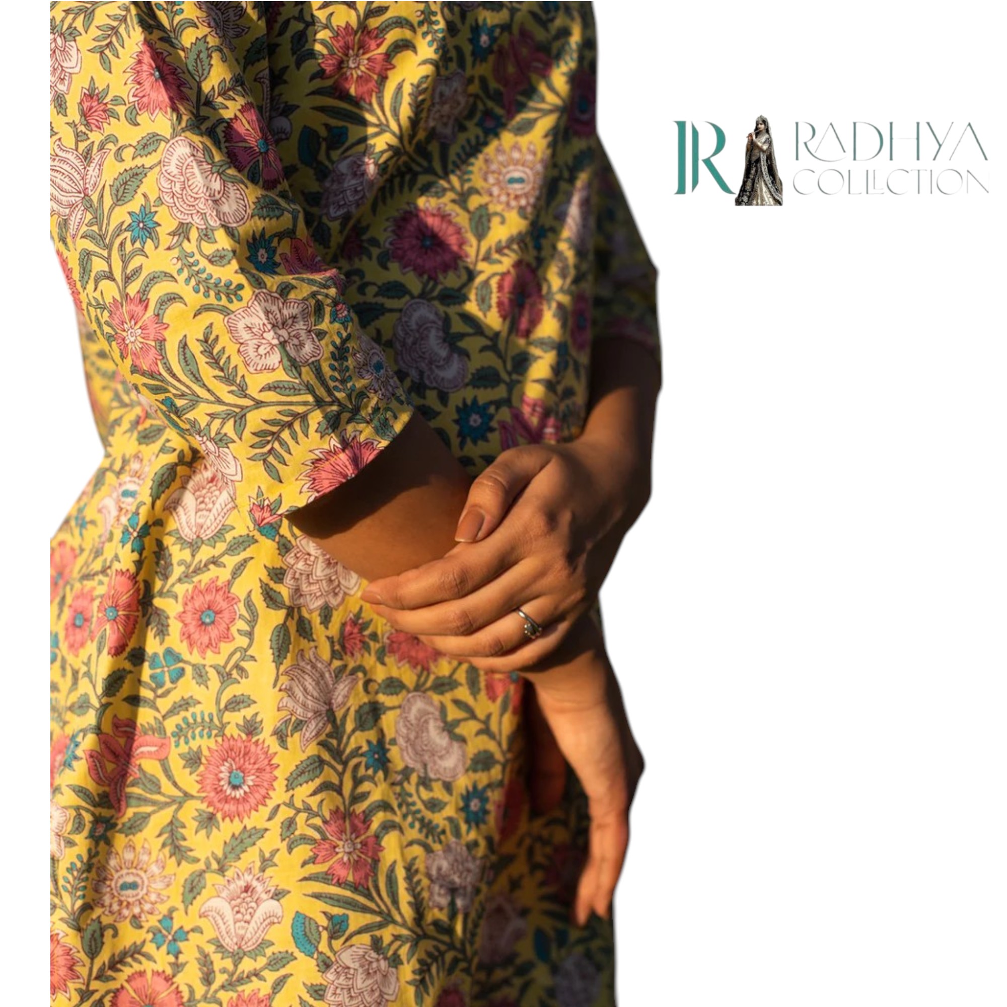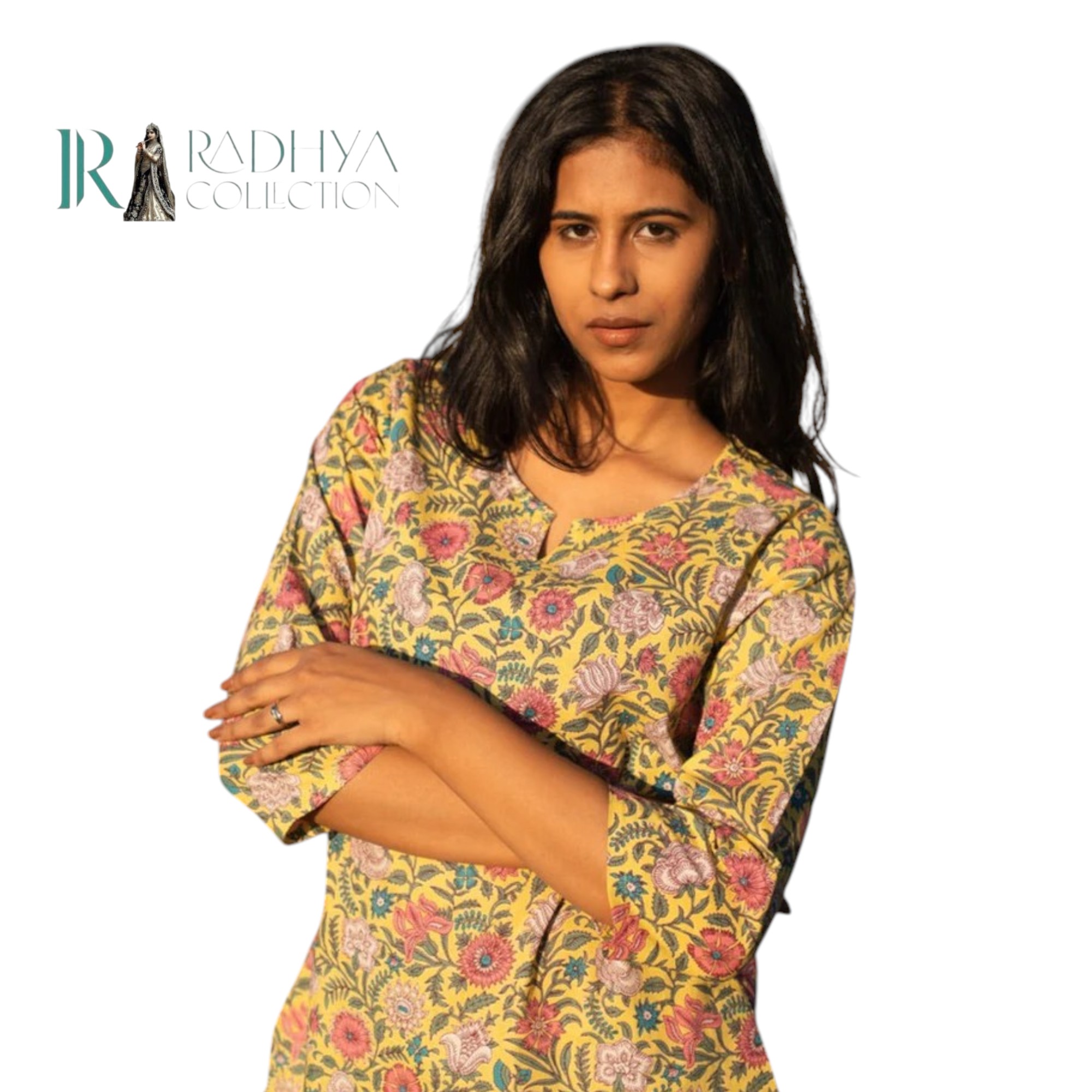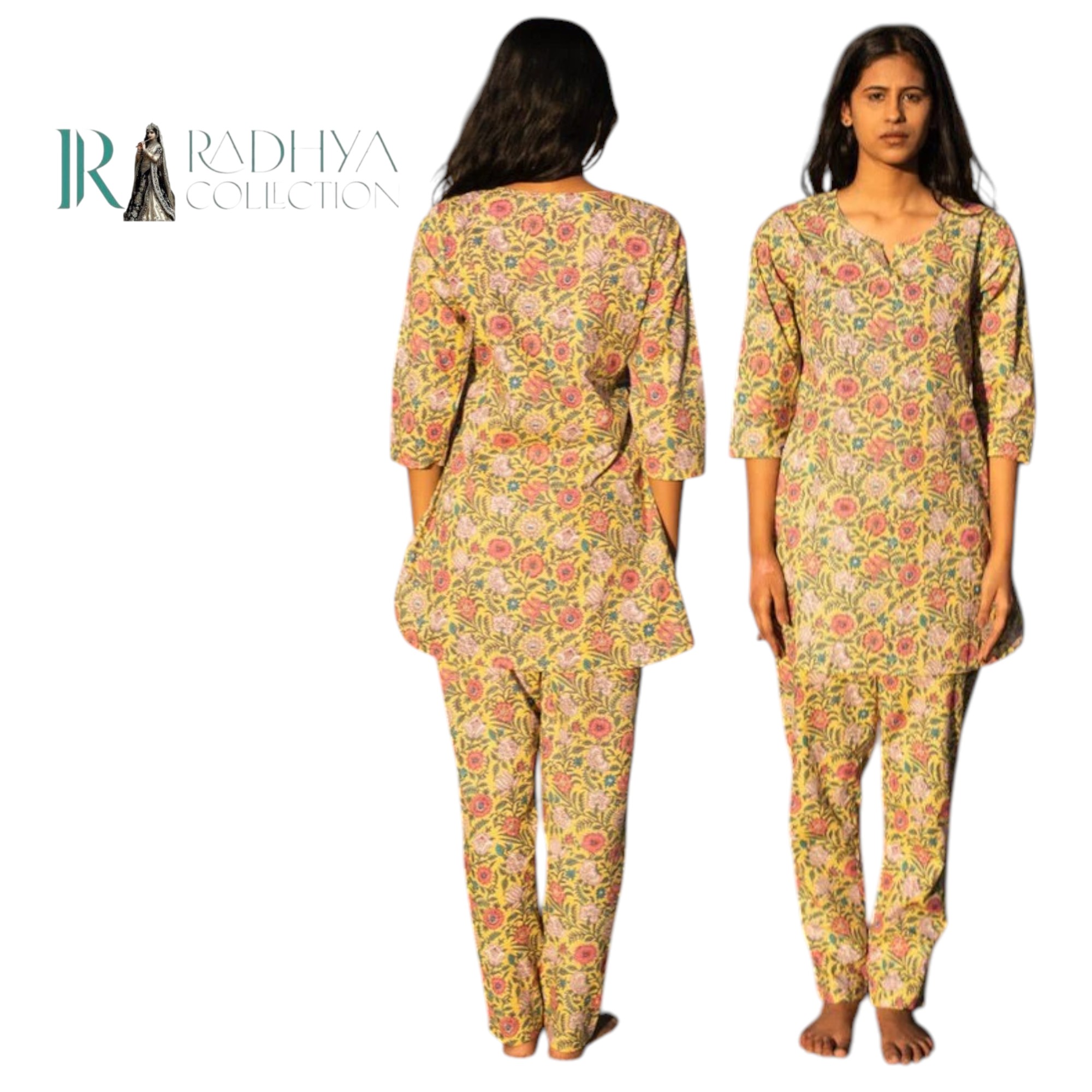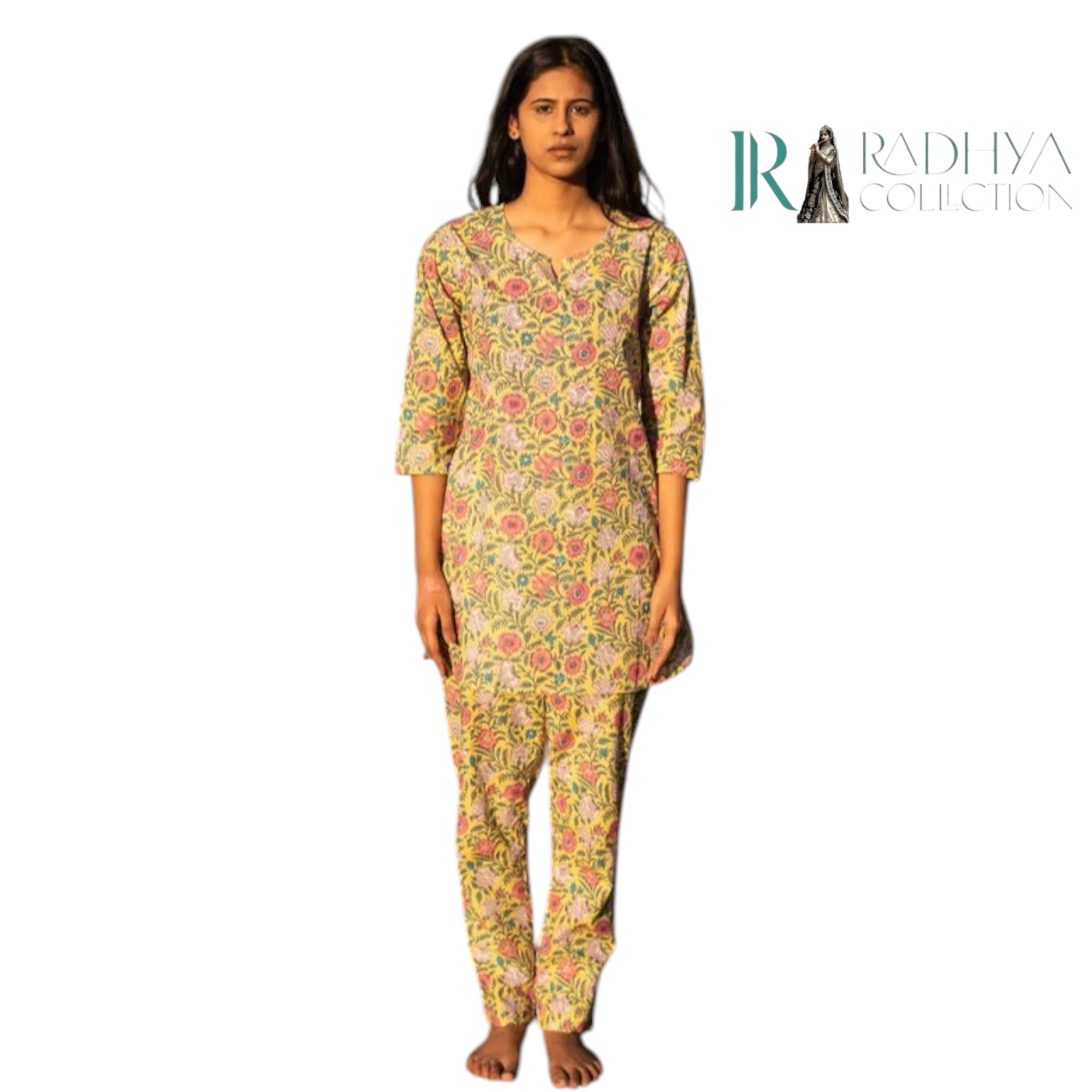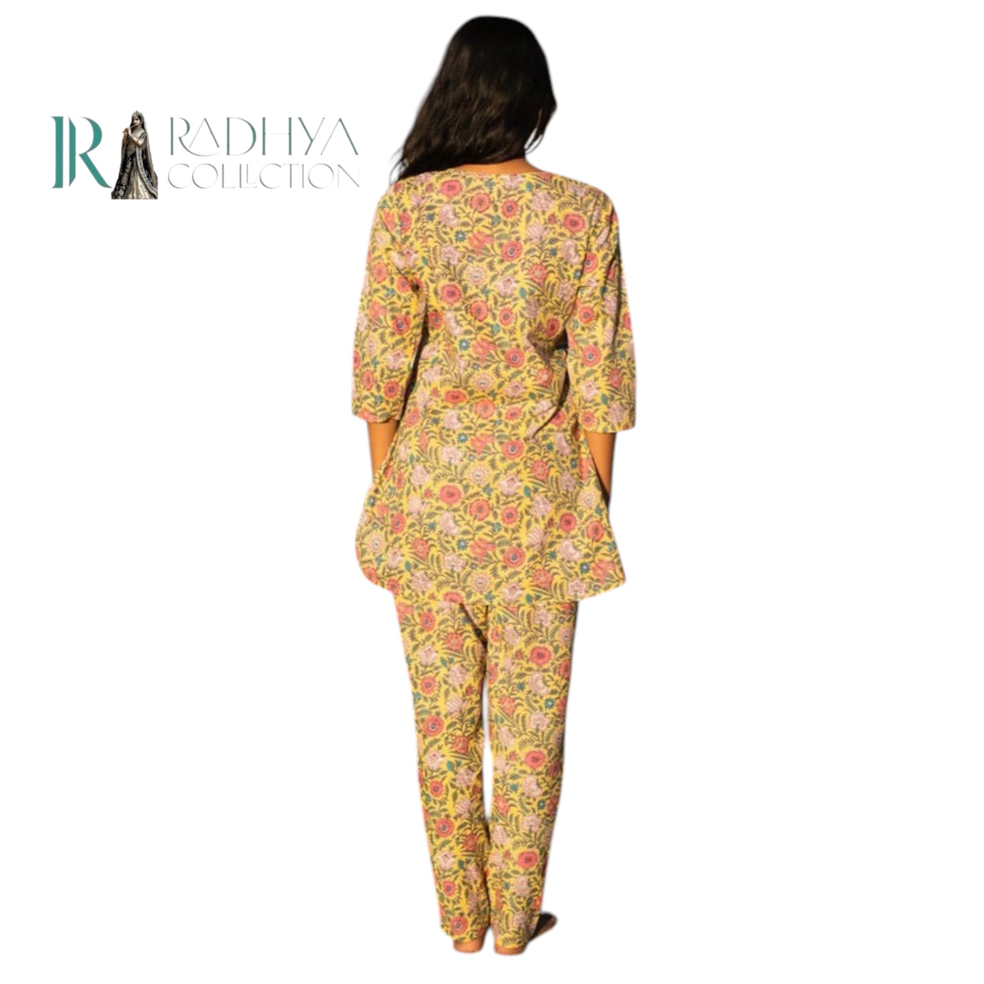Experience the perfect blend of comfort and charm with this floral cotton night suit from Radhya Collection. Designed in a soft yellow base with vibrant pink and green floral patterns, this set brings a fresh, cheerful vibe to your loungewear collection. The straight kurta with a notched neckline and 3/4th sleeves pairs beautifully with matching straight-fit pants, ensuring both style and ease. Crafted from breathable pure cotton, it’s perfect for relaxed evenings, cozy nights, or laid-back weekends at home.